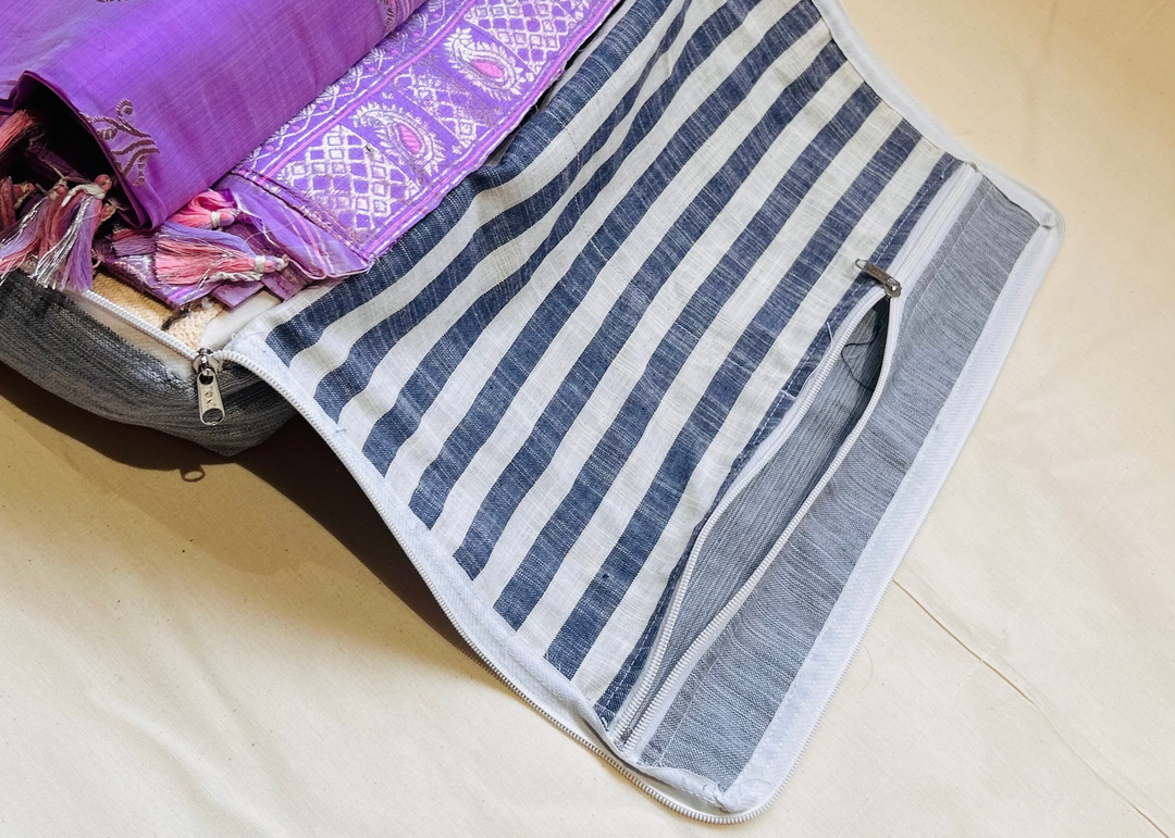 Lightweight and just the right size, these bags fit comfortably into both medium or large suitcases. Your sarees stay crease-free, easy to access, and travel-ready.