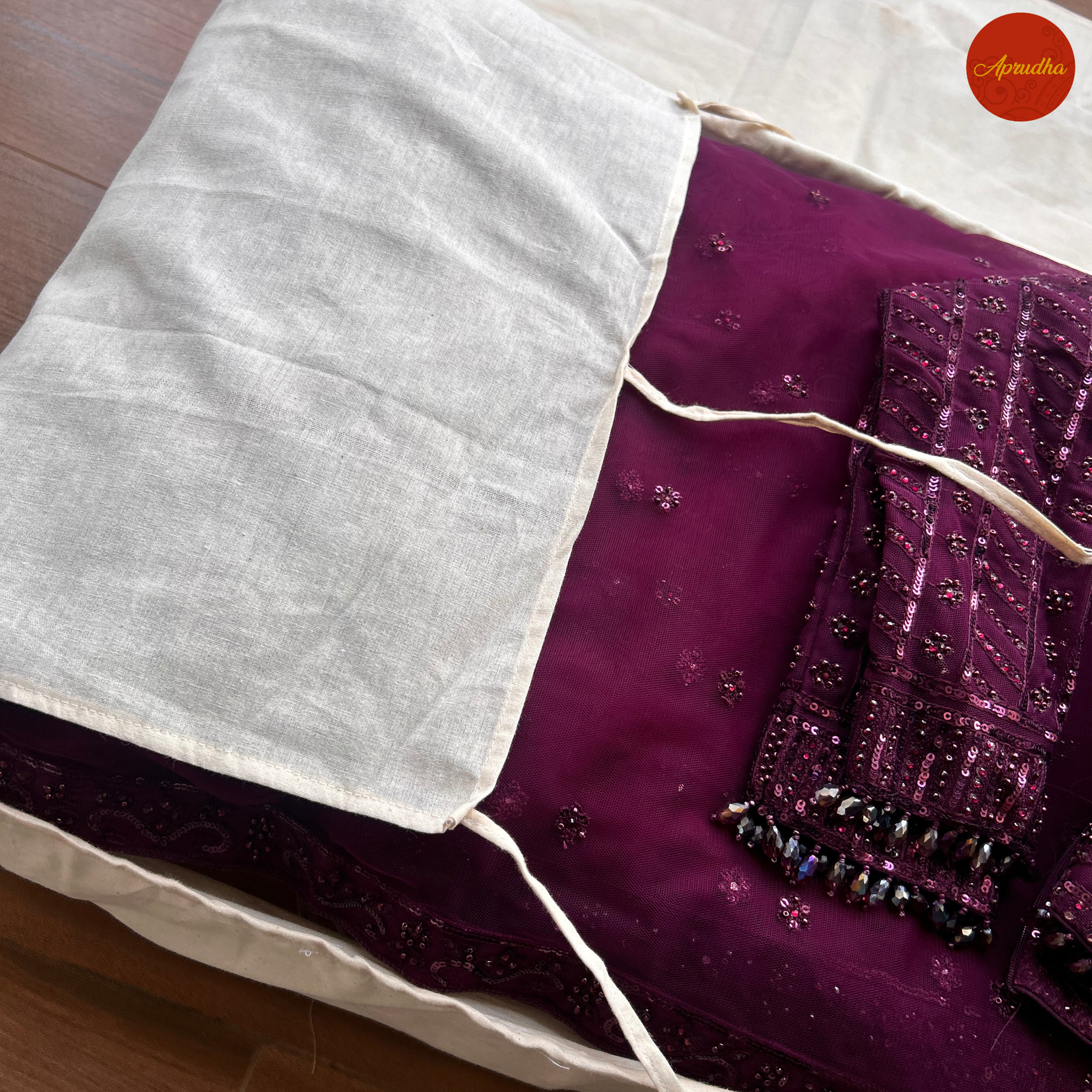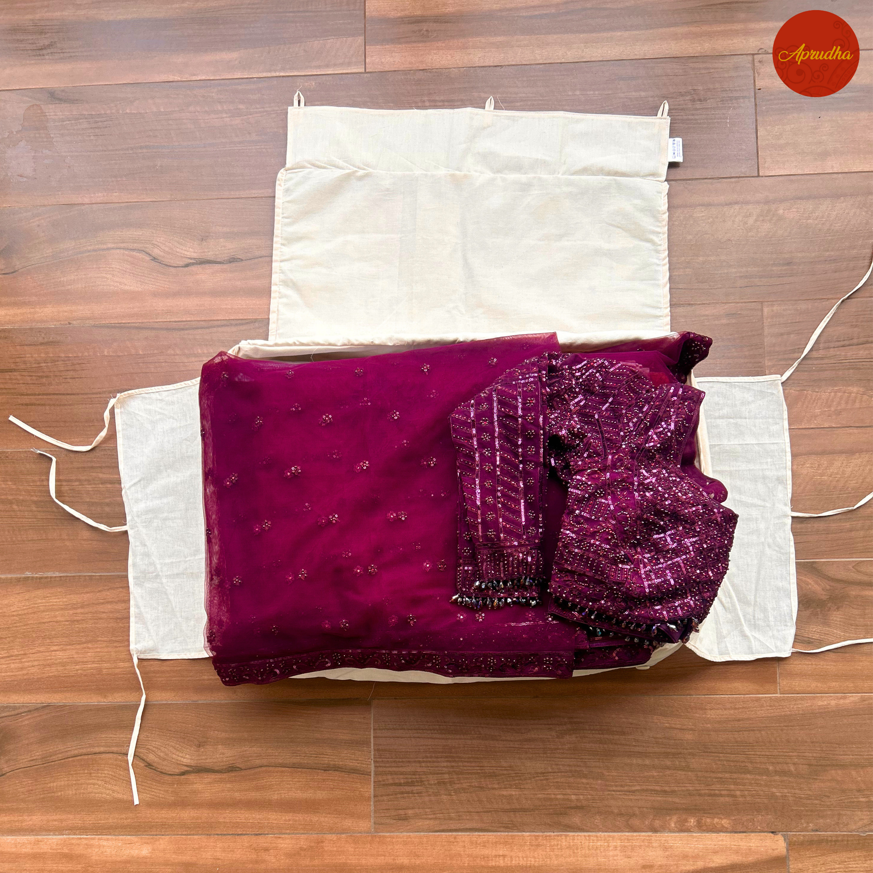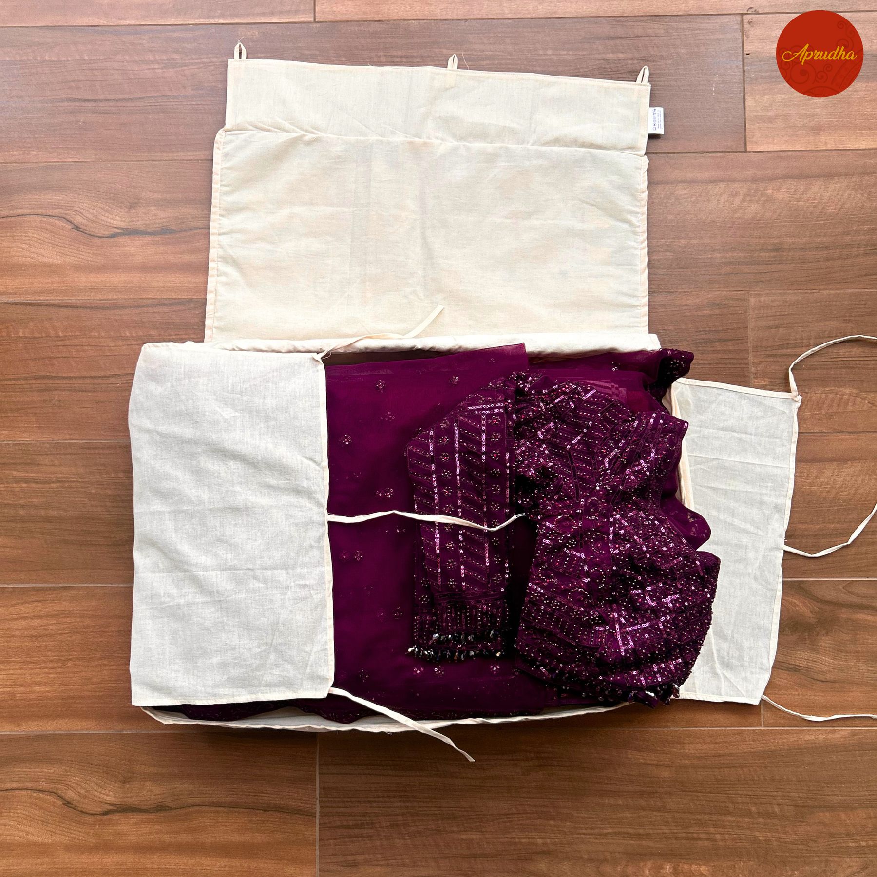 Crafted from premium breathable cotton, the bag allows airflow while protecting the lehenga from dust, humidity, and fabric damage. This helps preserve delicate zari, embroidery, and silk fabrics, making it ideal for both short-term use during weddings and long-term preservation.